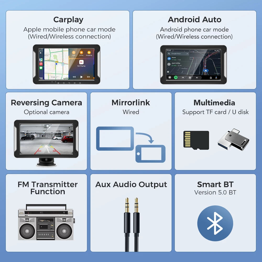[Updated model will be shipped, optics vary slightly] Revamp your driving experience instantly with this innovative Car Play System, designed to transform your vehicle from outdated to state-of-the-art in seconds. Just plug it into your car's cigarette port, compatible with any vehicle, and watch as your car's interior goes from mundane to magnificent. It easily sticks to your dashboard or windscreen, offering a seamless connection to your phone via Bluetooth or AirPlay. This system isn't just about aesthetics; it features a touchscreen display, a built-in microphone for hands-free communication, and, as a special bonus, a free reversing camera. Unlike expensive garage installations, this user-friendly system installs quickly and effortlessly, saving you both time and money while elevating your driving experience.